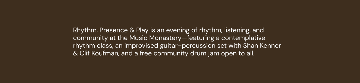Rhythm, Presence & Polyrhythm Workshop $20.00 Sign Up DUO PERFORMANCE-Guitar and Percussion $10.00 Get tickets Class + Concert: Full Experience Bundle $25.00 Sign up for bundle Community Drum Jam-8:00 PM $0.00 Sign up for free